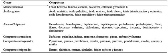 Tabla 15 Compuestos principales del biocrudo obtenido mediante un proceso HTL. Adaptado y traducido al español de Gollakota, 2018 bajo licencia Creative Commons [63]