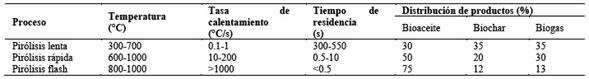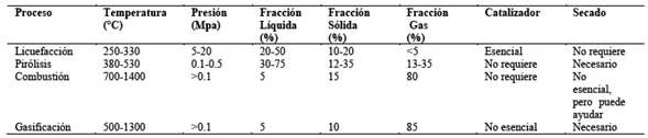 Tabla 2 Comparación de los procesos y fracciones de productos de conversión termoquímica. Elaboración propia en base a referencias [36,38]
