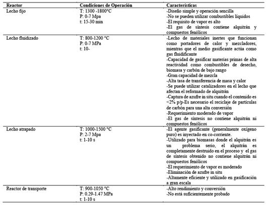 Los gasificadores se pueden dividir en diferentes tipos, como el de lecho fijo (corriente ascendente y descendente), lecho móvil, lecho fluidizado (burbujeante y circulante) y el gasificador de flujo atrapado (Tabla 3).