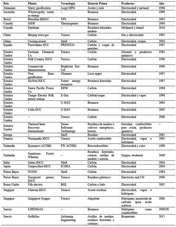 Tabla 4 Plantas comerciales con tecnología de gasificación en el mundo. Elaboración propia en base a referencias [41,55].
