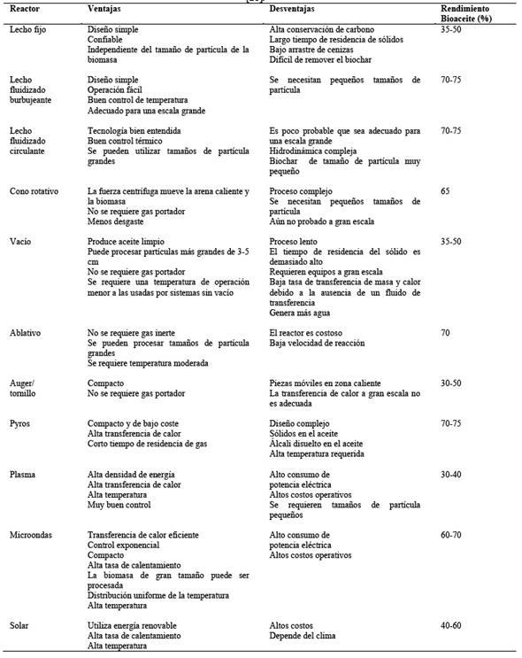 A lo largo de los años se han diseñado diversos tipos de reactores para optimizar el desarrollo de los procesos de pirólisis y la producción de bioaceites de alta calidad. Sin embargo, cada tipo de reactor tiene sus propias características, rendimientos de bioaceite, ventajas y desventajas. Entre éstos, los reactores más populares se describen en la Tabla 6.