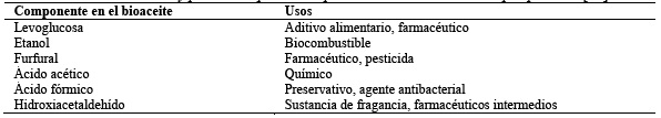 A partir del bioaceite pirolítico se pueden obtener diversos productos con diferentes aplicaciones en distintos campos, algunos de ellos se encuentran en la Tabla 7.
