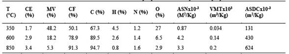 Se determinaron las características superficiales de la cáscara de castaña y de las muestras de biochar mediante mediciones de adsorción física de nitrógeno y dióxido de carbono, valores que se muestran en la Tabla 8. 16. El área superficial específica en nitrógeno (ASN) que reportaron para la cáscara de castaña fue de 0.12x10-3 m2/Kg, un volumen total de microporos (VMT) de 0.030x103 m3/Kg y un área superficial aparente en dióxido de carbono (ASDC) de 118x10-3 m2/Kg [16].