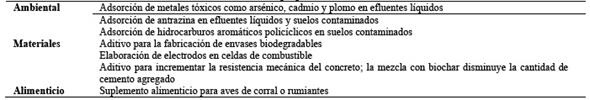 Tabla 9 Aplicaciones del biochar. Reproducido de Palomo Gonzáles, 2020 bajo licencia creative commons CC BY-NC-ND 4.0 [36].