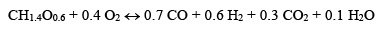 Donde CH1.4O0.6 representa una fórmula simplificada para biomasa seca libre de cenizas, y ésta reacciona con el agente oxidante (oxígeno) a altas temperaturas produciendo monóxido de carbono, hidrógeno, dióxido de carbono y vapor de agua 32.