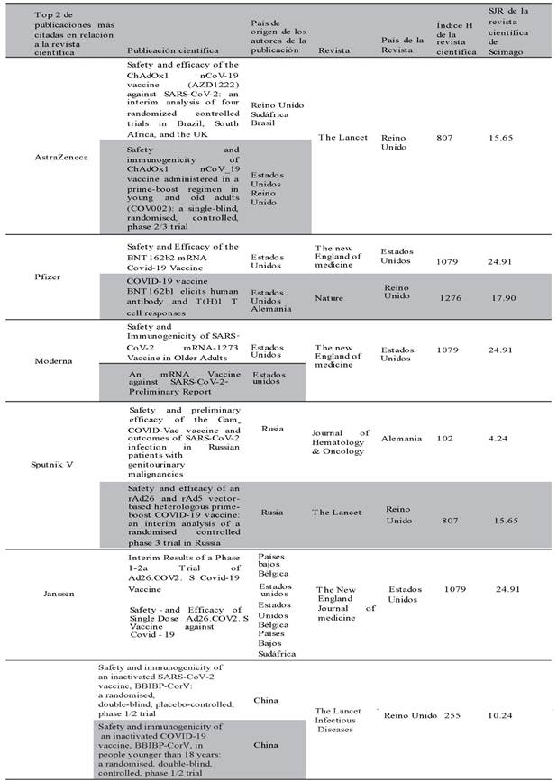 La producción científica respecto a las vacunas de la Covid-19, la más citada fue la Vacuna pfizer en la revista The New England Journal of Medicine mediante Google académico, a sí mismo, de manera sucesiva se citaron las vacunas Pfizer, Moderna y Janssen haciendo un total de 11 154 citaciones. En la revista The Lancet se citaron las vacunas AstraZeneca, Sputnik V y Sinopharm haciendo un total de 5 067 citaciones. En relación al apoyo en las citaciones de las vacunas de la covid 19 a través de Google académico se relaciona con la distribución mundial de cada una de ellas11-13.