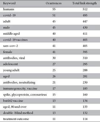 Se evidencia dentro del total de las publicaciones de cada una de las 6 vacunas evaluadas en relación a su producción científica, la publicación científica con la mayoría de citaciones (Safety and Efficacy of the BNT162b2 mRNA Covid-19 Vaccine, donde los autores son Polack FP et al) pertenece a la Vacuna Pfizer tiene un total de 7801 citaciones en Google académico, a diferencia de la publicación más citada (Safety and immunogenicity of an inactivated SARS-CoV-2 vaccine, BBIBP-CorV: a randomised, double-blind, placebocontrolled, phase 1/2 trial, donde los autores son Xia S et al) de Sinopharm con 701 citaciones hasta la fecha de envió de este documento a la revista científica, ver más detalles en la tabla 1. En relaciones a la suma de citaciones recibidas de las publicaciones de cada vacuna, se ve un predominio global por citaciones de 14 publicaciones de tipo ensayo clínico aleatorizado de la vacuna Pfizer, a diferencia de las restantes publicaciones de las demás vacunas, donde las citaciones recibidas a las 2 publicaciones relacionadas con Sinopharm con un total de 721 citaciones, ver más detalles en tabla 2. Se evidencia un predominio de publicaciones en relación al origen de los autores como Estados unidos, Reino Unido y Países bajos, con colaboración con Bélgica y Alemania, de manera semejante del origen (Estados unidos y Reino unido) de la revista de publicación (The Lancet y The new England of medicine), con SCImago Journal Rank (SJR) > 10, ver más detalles en tabla 3 y figura 2. En relación a las palabras clave con más recurrencias usadas para el tema de las 6 vacunas frente a la Covid-19, son Humanos, Covid-19, Hombre, Vacunas Covid-19, adulto, entre las palabras con frecuencia de recurrencia entre otras, ver más detalles en tabla 4.