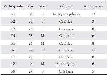 Se realizó un muestreo por conveniencia20 en las instituciones pertenecientes a un segundo nivel de atención, se consideró el criterio de saturación cuando ya se tuvo la información suficiente para el estudio contando con nueve participantes. Se consideraron los criterios de inclusión: personal de enfermería hombres y mujeres que hayan atendido a pacientes con cuidados paliativos, mayores de 18 años de edad, que laboren en alguna institución de salud pública que ofrezca atención de segundo nivel, con experiencia en ofrecer los cuidados paliativos y labore en el estado de Guanajuato.
