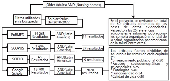 El tipo de estudio que se realizó es una revisión temática. En el cual, se realizó un flujograma (Figura 1) con el fin de obtener información de diferentes bases de datos como PuBMED/MedLine, SCOPUS, Scielo y GOOGLE SCHOLAR. En ese orden de ideas, en la presente revisión, se abordará de manera general la situación actual del envejecimiento mundial, factores biopsicosociales asociados a la institucionalización de adultos mayores, las patologías más comunes en adultos mayores institucionalizados y sus técnicas de diagnóstico, la funcionalidad y el grado de dependencia de estos adultos mayores institucionalizados, las escalas para la medición de estas, así como también un apartado para la calidad de vida del adulto mayor institucionalizado.