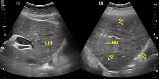 Figura 2. Ecografía abdominal que evidencia imágenes hipoecogenicas de diferentes tamaños en lóbulo hepático derecho compatibles con microabscesos (derecha) y persistencia de colédoco dilatado (izquierda).
