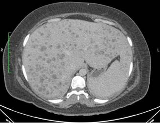 Figura 4. Tomografía axial computarizada de abdomen con contraste (corte axial) que evidencia la presencia de múltiples microabscesos distribuidos en ambos lóbulos hepáticos.