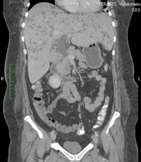 En la analítica de laboratorios al ingreso presentaba leucocitosis de 26 500/ml, con neutrofilia del 93% y presencia de cayados en 1%, anemia moderada de 9.5 g/dl normocitica normocromica, trombocitopenia leve de 140 000/ml, hipoglicemia de 58 mg/dl, perfil de pruebas hepáticas con patrón obstructivo y colestasico con GOT 26, GPT 31, Bilirrubina total 9,4, Bilirrubina directa 6,6, Bilirrubina indirecta 2,8, FAL 367, GGTP 166, con resto de analítica de coagulograma, función renal, electrolitos, amilasa y lipasa dentro de parámetros normales.