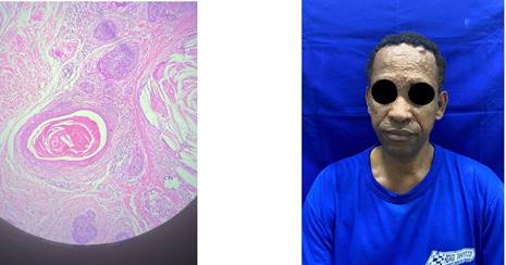 Paciente de 52 años, masculino, refiere inicio del cuadro clinico a los 13 años de edad aproximadamente, con lesiones papulonodulales, normocromicas, de consistencia firme, localizadas en region central del rostro, area preauricular y cuero cabelludo, mas aumento progresivo en el transcurso del tiempo, niega otros sintomas. Como antecedentes familiares menciona que algunos parientes de primer grado presentan lesiones similares.