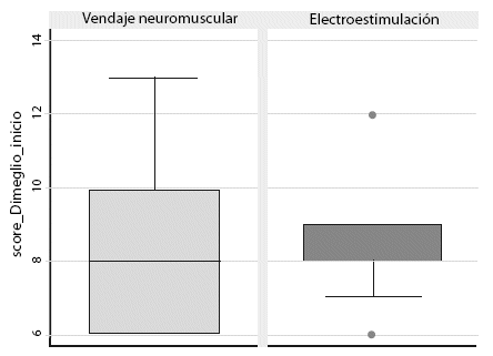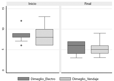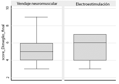 Según el puntaje de Score de Dimeglio al inicio del estudio, la electroestimulación presentó un promedio de 8,64±1,86 puntos, y para el vendaje neuromuscular de 8,73±2,53 puntos; evidenciando que ambos grupos eran iguales al inicio del estudio. Luego de la intervención, el puntaje de Score de Dimeglio en el grupo de la electroestimulacion, presentó un promedio de 5,45±1,5 puntos, y en el grupo del vendaje neuromuscular de 5,27±1,95 puntos, la diferencia entre los promedios no fue estadísticamente significativa (p=0.809) (Tabla 2, Figura 1), sin embargo, en relación a la disminución de la deformidad presentada al inicio, se evidenció que fue mejor en el grupo del vendaje neuromuscular (Figura 2 y 3).