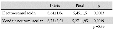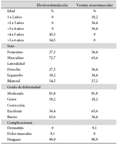 Según el grado de deformación al inicio del estudio, tanto en el grupo de pacientes con electroestimulación y de vendaje neuromuscular, el 81,8% presentó deformidad moderada y el 18,2% presentaba deformidad grave, evidenciando que en ambos grupos la mayoría presentó deformidad moderada al inicio del estudio. Sin embargo, en la valoración de la corrección al final, en el grupo de electroestimulación, el 63,6% de los pacientes presentó una corrección buena y el 36,4% una corrección excelente, en cambio en el grupo de vendaje neuromuscular, el 63,6% de los pacientes presentó una corrección excelente y el 36,4% una corrección buena, en el cual la diferencia entre ellos no es estadísticamente significativa (p=0,39), confirmando que el grupo de vendaje neuromuscular presento mayor corrección de la deformidad comparada con el grupo de electroestimulación (Tabla 1).