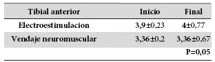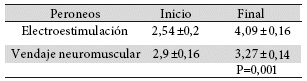 La fuerza muscular al inicio, las medias de puntaje del tibial anterior fueron de 3,9±0,23 para electroestimulación y 3,36±0,2 puntos según la escala de Daniels para el vendaje neuromuscular. De igual forma la fuerza muscular los peroneos, para vendaje neuromuscular el promedio del puntaje fue de 2,9±0,16 puntos y para la electroestimulación de 2,54±0,2 puntos. Evidenciando que, al inicio la fuerza muscular de tibial anterior fue de 3 en promedio, y de los peroneos de 2 según la escala de Daniels. Sin embargo, la fuerza muscular al final del tibial anterior, los promedios del puntaje de fuerza muscular fueron con el vendaje neuromuscular de 3,36±0,67 puntos de la escala de Daniels y para la electroestimulación de 4±0,77 puntos, esa diferencia fue estadísticamente significativa (p=0,0531). Evidenciando que existió una mejoría en cuanto a la puntación al final, con un aumento más representativo con el uso de electroestimulación en cuanto al tibial anterior. En cuanto a la fuerza muscular al final de los peroneos, los promedios del puntaje de fuerza muscular fueron con el vendaje neuromuscular de 3,27±0,14 puntos y para la electroestimulación de 4,09±0,16 puntos según la escala de Daniels, esa diferencia también fue estadísticamente significativa (p=0,0011). Evidenciando de esta manera, la mejora de fuerza muscular, especialmente con el uso de electroestimulación (Tabla 3 y 4).