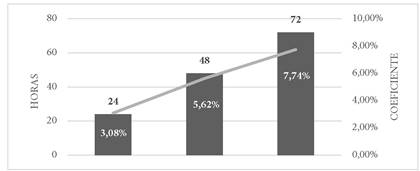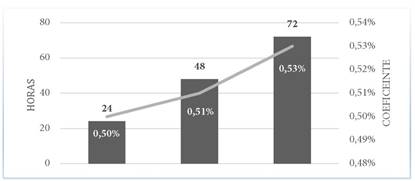 La relación de coeficiente de variación del tubo amarillo vs el tiempo en horas (24,48,72), donde se observa que a las 24 horas la primera barra es 0,50 %; en la segunda barra a las 48 horas, se percibe que el dato subió un 0,01%, manteniéndose dentro del requisito de calidad; a las 72 horas subió un 0,03%, sin sobrepasar el rango del requisito de calidad aceptado y, por ende, manteniendo el suero y el analito están bien conservados (Figura 1).