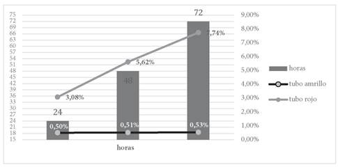 Por otro lado, en la relación del coeficiente de variación del tubo rojo vs las horas (24,48,72), se aprecia que, a las 24 horas, el dato es de 3,08%; en la segunda barra el dato sobrepasó un 2,54%, sin exceder el rango del requisito de calidad; mientras que a las 72 horas subió un 4,66%, superando el rango del requisito de calidad y, por ende, el tubo rojo no mantiene el analito en condiciones estables (Figura 2).