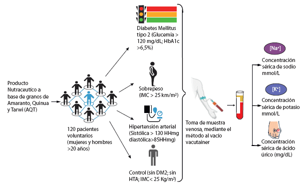 El presente trabajo tiene como objetivo evaluar si un producto nutracéutico basado en amaranto, quinua y tarwi (AQT) coadyuva en el tratamiento de la DM2, el sobrepeso y la hipertensión, mejorando el estado de salud de los pacientes. Se busca determinar si el consumo de este producto regula y mantiene los niveles normales de [Na+], [K+] y ácido úrico en los participantes.