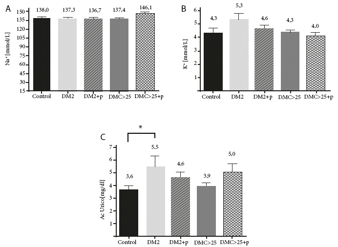 Figura 2. A). Concentración de sodio sérico en pacientes diabéticos y con sobrepeso; B) concentración de potasio en pacientes con diabetes mellitus tipo 2 y sobrepeso; C). Concentración de ácido úrico en pacientes diabéticos y con sobrepeso. Después de tres meses de consumo del producto AQT. +p (consumo del producto), diabetes mellitus tipo 2 (DM2) y sobrepeso (IMC> 25). Significancia estadística * p< 0,05.