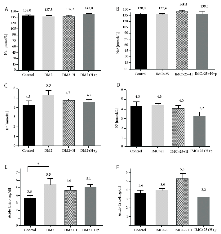 Figura 3. A) Concentración de sodio sérico de pacientes con diabetes tipo 2 y pacientes con diabetes e hipertensión; B) Concentración sérica de sodio en pacientes con sobrepeso e hipertensión; C) Niveles de potasio en sangre en pacientes con diabetes y diabetes con hipertensión; D) Concentración sérica de potasio en pacientes con sobrepeso e hipertensión; E) Niveles de ácido úrico en sangre en pacientes diabéticos y diabéticos con hipertensión; F) Concentración sérica de ácido úrico en pacientes con sobrepeso y sobrepeso e hipertensión. Los valores fueron medidos después de tres meses de consumo del producto AQT. +p (consumo del producto), diabetes mellitus tipo 2 (DM2), diabéticos e hipertensos (DM2+H), sobrepeso (IMC> 25) y sobrepeso e hipertensos (IMC> 25+H). Significancia estadística * p< 0,05.