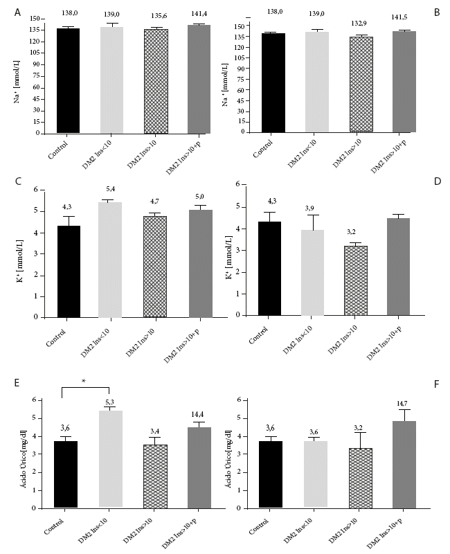En pacientes con DM2, los niveles de sodio sérico se incrementaron de 138,0 (control); 139,0 (DM2 Ins<10); 135,6 (DM2 Ins>10) a 141,1 mmol/l (DM2 Ins>10+p) (Figura 4. A) y en pacientes con sobrepeso se observó valores de 138,0 (control); 140,2 (IMC>25 Ins<10); 132,9 (IMC>25 Ins>10) a 141,5 mmol/l (IMC>25 Ins>10+p) (Figura 4. B).