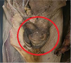 Durante el proceso de exploración externa de cadáver seleccionado para disección anatómica de sexo masculino de aproximadamente 40 años de edad, 1,65 cm de altura medido con cinta métrica y un peso aproximado de 75 Kg, en la sala de anfiteatro del departamento de morfologia de la Universidad Privada del Valle sede Cochabamba nos percatamos de un aumento de volumen a nivel inguino escrotal del lado izquierdo de 20 cm de longitud y 12 cm de ancho, de características hemiarias, por lo cual se procedió a realizar la disección bajo los siguientes detalles: (figura 1, 2)