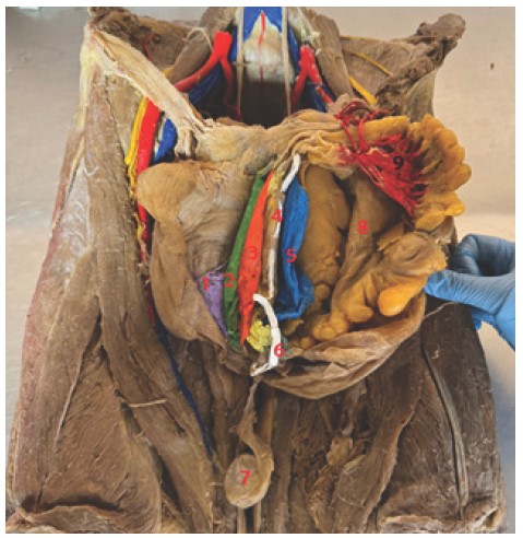 Pieza anatómica pintada con fines didácticos donde se observa: