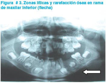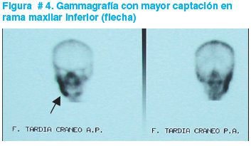 El estudio radiológico panorámico de la zona afectada es de gran ayuda para el diagnóstico; la radiolucencia periapical u ósea y la presencia de zonas líticas correlaciona firmemente con infección (Figura # 3). La gammagrafía con Tc99 está indicada ante la mínima sospecha de osteomielitis; en el estudio se observa zonas de mayor captación de material radioactivo (Figura # 4) constituyéndose en una medida fundamental para el diagnóstico. La tomografía axial computarizada es un utensilio útil para evaluar las infecciones de espacios profundo de cara y cuello; a través de éste estudio es posible precisar la presencia de colecciones purulentas (absceso) o celulitis y de esta manera facilitar la labor del cirujano. Los estudios hematimétricos y reactantes de fase aguda (velocidad de sedimentación globular y proteína “C” reactiva [PCR]) deben efectivizarse en pacientes febriles o cuando existe compromiso del estado general. Ante sospecha de septicemia se solicitarán hemocultivos.