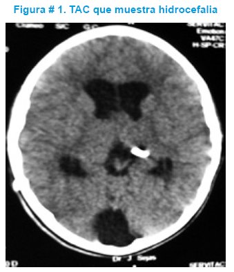 Los exámenes de laboratorio de rutina fueron normales. La TAC simple de cráneo informó hidrocefalia aguda severa, la misma que fue resuelta por una derivación ventrículo peritoneal, con evolución posterior favorable y fue dado de alta al 5to día post operatorio. Ver figura # 1.