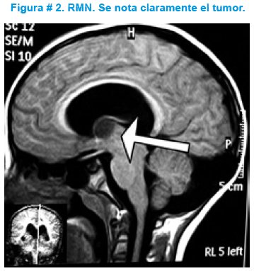 Aproximadamente dos años después presentó 8 días de cefalea holocraneana, de tipo opresivo, no irradiado, vómitos en proyectil, que no cedieron al tratamiento. Se solicitó TAC de cráneo que demostró hidrocefalia aguda y disfunción valvular. Llamó la atención la presencia de una imagen iso-densa sobre el III ventrículo, por ello se solicitó resonancia magnética nuclear de cerebro que mostró la presencia de un tumor en región frontal del ventrículo lateral a nivel septal, de bordes definidos, circular, que separaba ambas hojas del septum pellucidum y obliteraba los agujeros de Monro. Ver figura # 2.