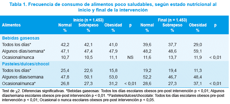 En las tablas 1 y 2 se observan la frecuencia de consumo de algunos grupos de alimentos según estado nutricional al inicio y final de la intervención. Al evaluar la ingesta de bebidas gaseosas, disminuye significativamente su consumo en los escolares obesos (p < 0,01) y además se incrementó el consumo de bebidas sin azúcar y agua mineral.