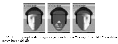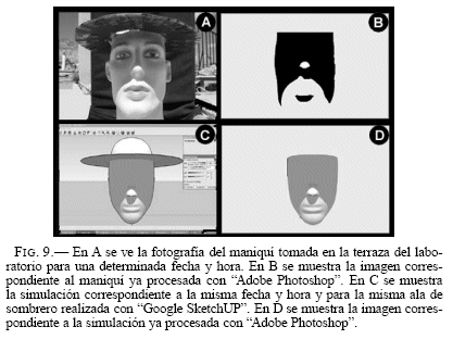 Con el fin de validar el protocolo de simulación desarrollado en el presente trabajo, se procedió a comparar las sombras sobre el rostro de un maniquí, con un sombrero horizontal de ala de 8 cm, y durante un día con cielo despejado (4 de agosto de 2008) con lo modelado para la misma situación . En la Fig. 9 se puede observar parte del procedimiento de comparación.