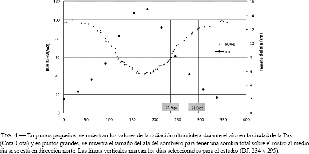 Haciendo un análisis del índice de radiación ultravioleta a lo largo del año (incluyendo la nubosidad) se eligieron dos días de particular interés para nuestro estudio (ver Fig. 4). Primero, el 21 de agosto (día juliano 234), por estar aproximadamente centrado entre el máximo y mínimo de radiación, y estar además, centrado entre el ala mayor y menor para tener la sombra total sobre el rostro al medio día. El segundo día elegido fue el 21 de octubre (día juliano 295), donde la radiación ultravioleta es relativamente alta (del orden de los 90 mW/m2) y la nubosidad aun no es demasiado elevada.
