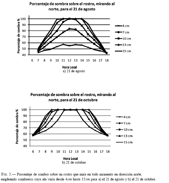 Con estas consideraciones, se realizó la simulación, para los días 21 de agosto y 21 de octubre, desde las siete de la mañana hasta las seis de la tarde, para sombreros con alas que van desde los 4 cm hasta los 15 cm. Los resultados de las simulaciones se pueden ver en la Fig. 5. Es interesante resaltar lo siguiente:
