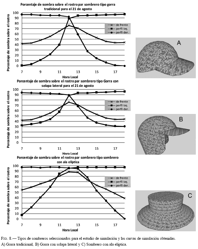 Con esta recomendación se tiene, por ejemplo, que para el día 21 de agosto se logre una sombra total sobre el rostro al medio día con cualquiera de los sombreros estudiados (ver Fig. 3).