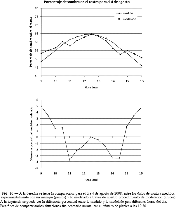 Como se puede apreciar en la Fig. 8, la simetría de la sombra sobre el rostro alrededor del medio día es evidente en las curvas con cruces, mientras que las curvas con cuadrados y círculos muestran, como era de esperarse, una clara dependencia mañana-tarde.