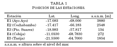 Como en un trabajo anterior (Peñafiel & Andrade 2013), se ha hecho una selección de cinco estaciones meteorológicas (Tabla 1) adecuadamente colocadas sobre los ejes territoriales longitudinal y transversal, y tomando en cuenta las principales zonas clim´aticas -altiplano, valles y llanos- las cuales representan también a las regiones fr´ıas, templadas y cálidas del país. El comportamiento climático en el territorio boliviano no difiere grandemente entre esas tres regiones: se tiene un lapso invernal seco y lluvias concentradas sobre todo en verano. Por esto, es interesante indagar sobre el grado de correlación de las estructuras de temperatura extrema entre todos los puntos considerados. Las operaciones numéricas aplicadas a los registros emp´ıricos tienen principalmente ese fin.