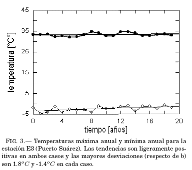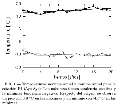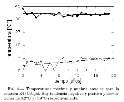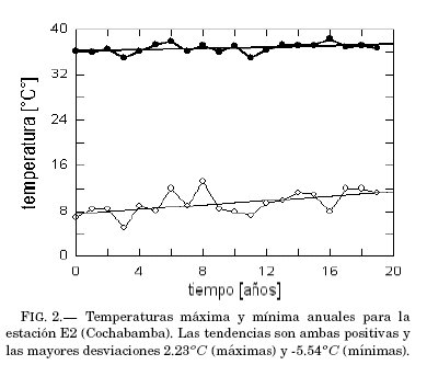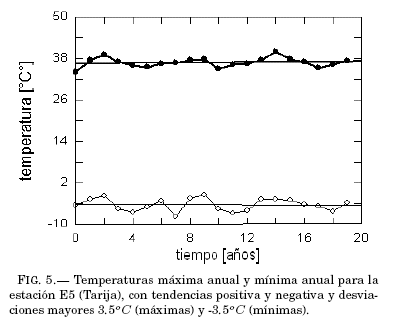 Se obtiene una evaluacion rápida de las estructuras extremas de temperatura examinando la evolucion anual de los máximos y mínimos valores anuales. Las figuras 1, 2, 3, 4 y 5 exhiben el grado de variacion de esos índices y su tendencia lineal (rectas at+b ajustadas por cuadrados mínimos) durante las dos decadas; los valores explícitos de los coeficientes de las tendencias lineales aparecen en las tablas 2 y 3.