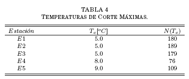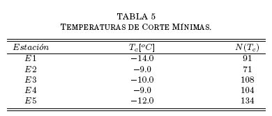 esto es, la temperatura de corte Tc corresponde a la frecuencia justamente mayor al 1% del registro (73 para todas las estaciones); para las máximas, N se cuenta desde el extremo de la cola superior, mientras que desde el extremo de la cola inferior para las mínimas (Tablas 4 y 5).