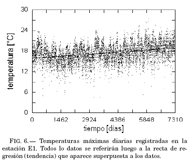 La cuestion de si las temperaturas, a lo largo de series temporales, se distribuyen en forma gaussiana no esta definitivamente establecida, y parece obedecer fuertemente a factores locales (v. g. Harmel & Richardson (2002)). Por ejemplo, refiriendo todas las temperaturas del registro para la estacion E1 a su recta de tendencia (recta de regresion), que se muestra en la figura 6, y construyendo el histograma de frecuencias con intervalos de un grado (Fig. 7), este admite el ajuste de una curva gaussiana,