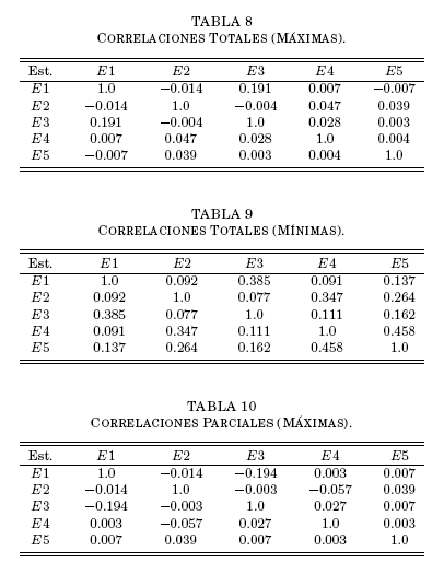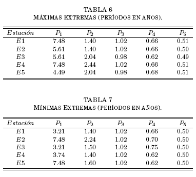 De estos resultados es muy evidente la clara independencia estadística de las series de valores extremos, especialmente de maximas. Pero más con-cluyente aun es el conjunto de correlaciones parciales que se obtiene considerando los elementos de las tablas 6 y 7 como elementos de la matriz simetrica