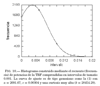 Para el presente trabajo, se ha hecho un recuento estadístico de la altura de las potencias de Fourier por intervalos y se ha aplicado un criterio de seleccion por percentiles semejante al de la ec. (2). Esto permite un analisis con criterio homogéneo sobre todas las series disponibles. La figura 10 grafica este recuento con un ajuste gaussiano por cuadrados mínimos; en este caso, el nivel aproximado de 99% corresponde al intervalo con cota 0.015. El resultado de aplicar este nivel sobre el espectro de la Fig. 9 es el de aislar los patrones de frecuencias centradas en 3, 16, 22, 34 y 44, que corresponden a períodos de 7.5, 1.4, 1.02, 0.66 y 0.51 anos, respectivamente. Los resultados de analisis similares para las máximas extremas en las otras estaciones estan reunidos en la tabla 6 y, para las mínimas extremas, en la tabla 7.