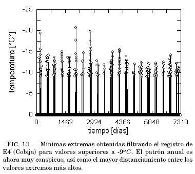 Como los criterios aplicados para obtener las series de sólo extremos (v. g., Fig. 11 y Fig 13) son los mismos para todas las estaciones, es posible aprovecharlas para los cálculos directos de correlación, total y parcial. Los resultados (Sec. 4) determinan concluyentemente que los registros no están correlacionados y que, por tanto, la presencia de extremos térmicos es un fenómeno muy local, no obstante la estacionalidad común.
