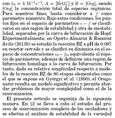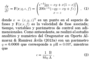 En el presente trabajo se emplea como modelo de la reaccion BZ el Oregonator tal como se plantea en Field & Noyes (1974), es decir, un esquema de cinco etapas irreversibles y tres variables dinamicas asociadas a especies quımicas, a partir del cual se estudia la sincronizacion y su estabilidad en un sistema de dos osciladores identicos acoplados difusivamente. La dinamica del Oregonator está descrita por el sistema de ecuaciones diferenciales expuesto en Gray & Scott (1994):
