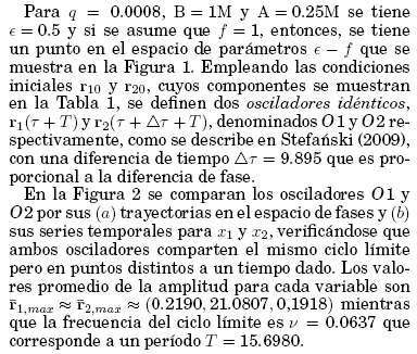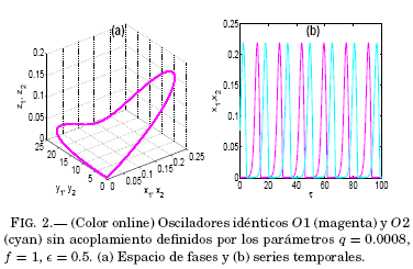 Considerando que los osciladores O1 y O2 estan acoplados segun (3) con k = 0.01 y un valor de p = 1.5 de modo que C = 0.015. Entonces, la integracion del sistema de ecuaciones a partir de las condiciones iniciales r10 y r20de la Tabla 1 proporciona la informacion que se muestra en la Figura 3. En las Figuras 3(a) y 3(b) se superponen, respectivamente, las trayectorias en el espacio de fases y las series temporales de la variable x de los osciladores acoplados, observandose una perturbación de sus trayectorias y en consecuencia de las amplitudes y períodos, seguido de la regulacion de dicho efecto caracterizada por la disminucion progresiva de la diferencia de fase, hasta que esta se anula una vez que ambos subsistemas ajustan sus ritmos de oscilacion sobre el ciclo límite que caracteriza al regimen de sincronización. En la Figura 3(c) se muestra la proyeccion del espacio de fases