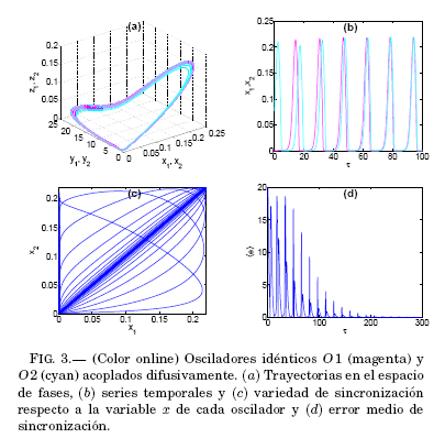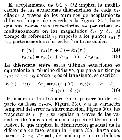 Se resalta el hecho de que si bien el termino difusivo en (3) se anula una vez que se alcanza el regimen de sincronización, éste puede volver a manifestarse bajo una variacion en el sistema 01O2 que hara que los osciladores O1 y O2 se distingan.