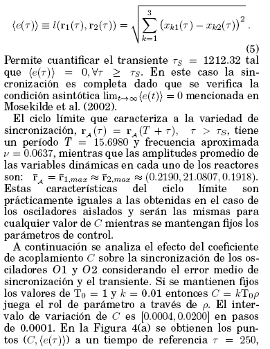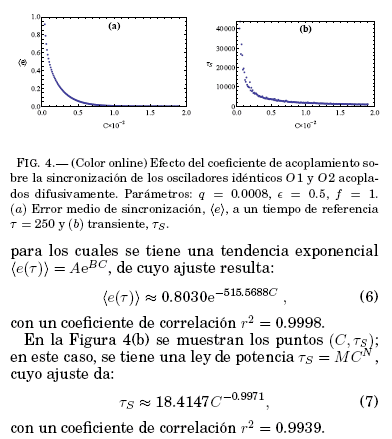 La dependencia del transiente respecto a la magnitud del coeficiente de acoplamiento segun una ley de potencia (7) indica que el acoplamiento implica la sincronizacion de 01 y O2 a un tiempo dado en el intervalo de C estudiado; segun (6), la tendencia de los osciladores acoplados a sincronizarse tambien se evidencia por la ley exponencial decreciente del error de sincronizacion a un tiempo de 250 respecto a C.