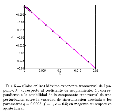 Se estudio un intervalo de valores del coeficiente de acoplamiento C de [0.0004, 0.0200], con pasos de 0.0001 para el subintervalo [0.0004,0.0015] y 0.0020 en el subintervalo [0.0020,0.0200]. La eleccion de las condiciones iniciales se hizo considerando que estas corresponden a un punto proximo a la variedad de sincronizacion, según dos casos: 1. se emplea una misma condicion inicial para cada valor de C y 2. se emplea una condicion inicial diferente para cada valor de C. En la Figura 5 se tienen los maximos exponentes transversales para el caso 2.