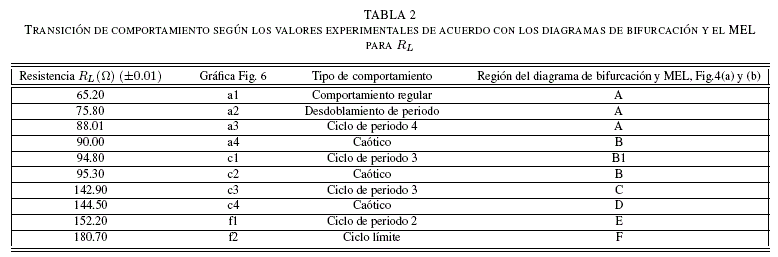 La constatación del comportamiento dinámico del sistema se verificó con el cálculo de los MELs. En la Fig. 4(b) las flechas indican las mismas regiones del diagrama de bifurcación, el comportamiento regular y caótico se puede evidenciar ya que el MEL es positivo en regiones caóticas como (B) y (D), negativo en regiones regulares como (A), (C), (E) y (F). La región indicada por (B1) tiene valores negativos del MEL y por lo tanto un comportamiento regular, este caso no es posible distinguirlo en el diagrama de bifurcación, pero si se pudo observar en el experimento.